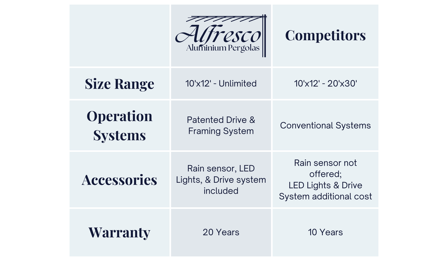 Absolutely, Alfresco Pergolas come with a comprehensive warranty! The aluminum framing is covered by a 20-year warranty, ensuring long-term durability. Our accessories come with their own manufacturer warranties, giving you extra assurance and protection for every part of your pergola.